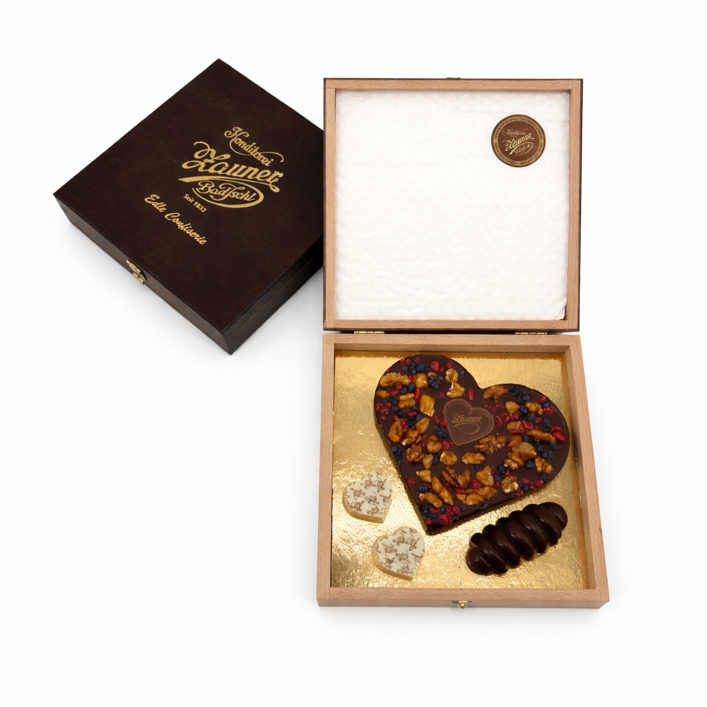 BIO-Zartbitterschokolade bestreut mit Nüssen, Veilchen und Himbeeren. Zudem schmückt ein Zaunerstollen Mini Mini und zwei Herzpralinen die edle Holzkassette.