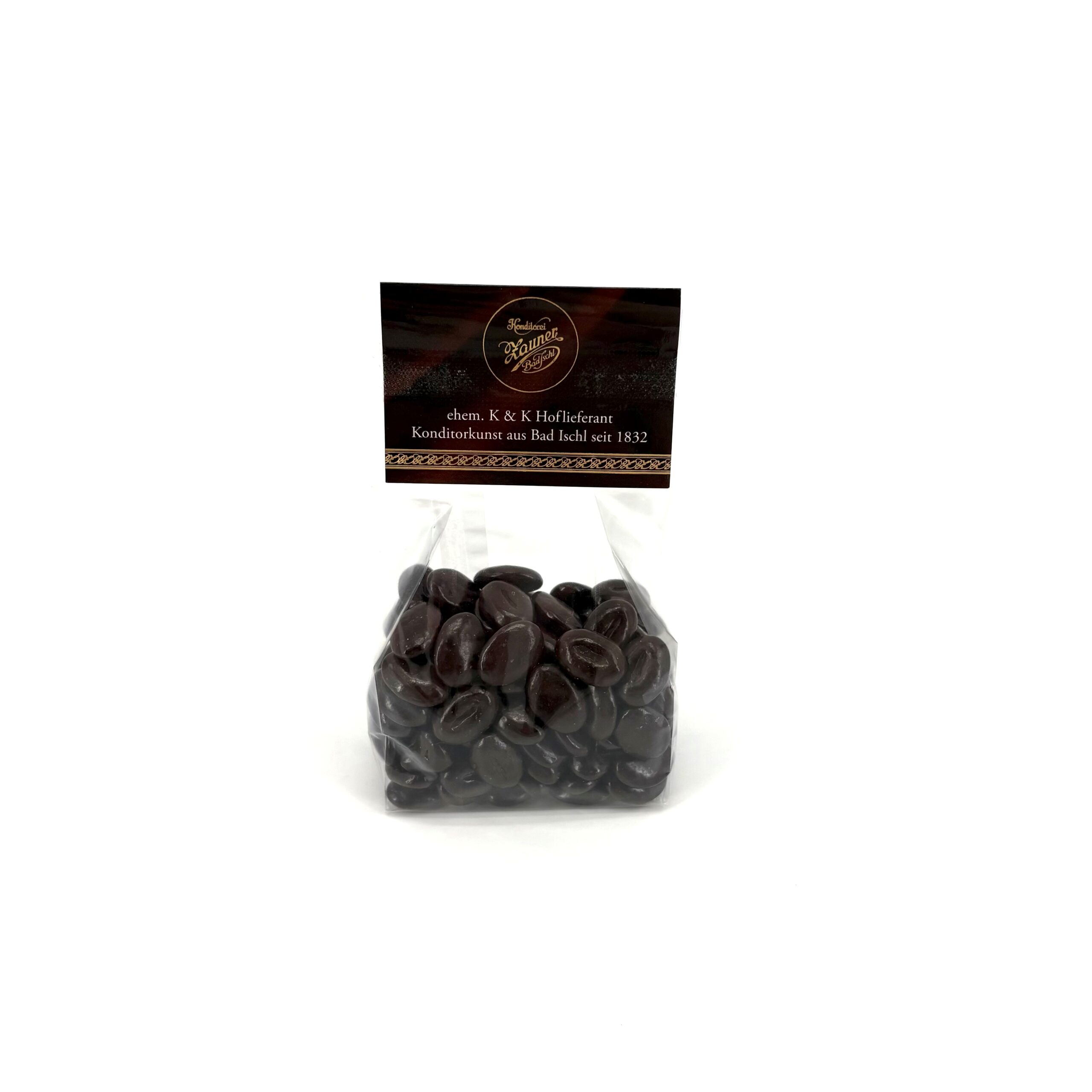 Mokkabohnen mit feinster Zartbitterschokolade umhüllt.